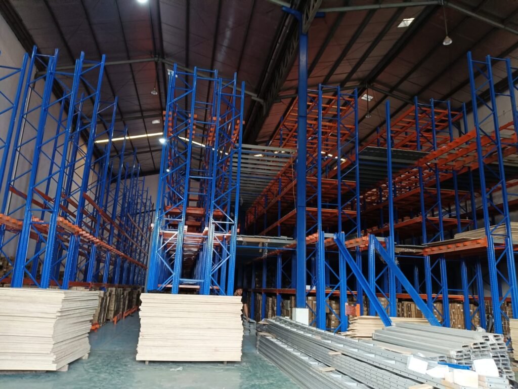Jika gudang retail Anda memiliki tinggi bangunan yang cukup, rak mezzanine bisa menjadi pilihan cerdas. Sistem ini menambahkan lantai tambahan di atas rak utama, sehingga ruang vertikal dapat dimanfaatkan secara maksimal. Mezzanine sering digunakan untuk menyimpan stok berlebih, dokumen penting, atau produk yang belum perlu dikeluarkan ke lantai penjualan.